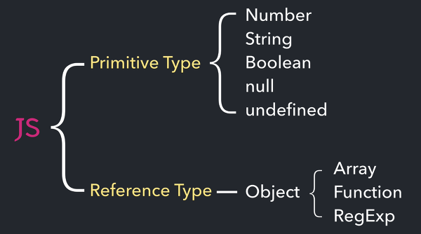 자바스크립트 데이터 타입은 크게 두가지인 원시형(Primitive Type)과 참조형(Reference Type)으로 분리된다. 기본(원시)형에는 Number, String, Boolean, null, undefined 가 있으며 ES6 에서는 Symbol 도 추가되었다고 한다. 참조형은 대표적으로 객체(Object)가 있고 그 하위에 배열(Array), 함수(Function), 정규표현식(RegExp) 등이 있다. 두 타입의 가장 대표적인 차이로는 기본형에는 바로 값을 그대로 할당한다는 것이고 참조형에는 값이 저장된 주소값을 할당(참조)한다는 것이다.