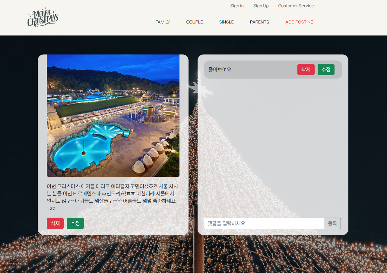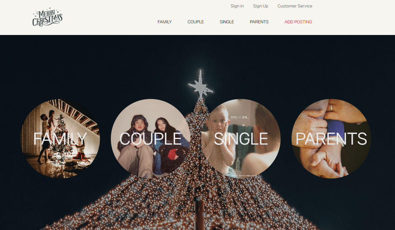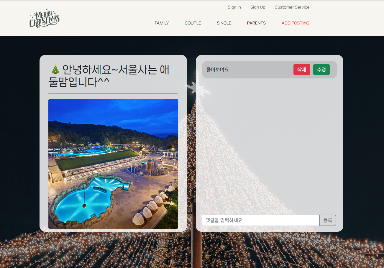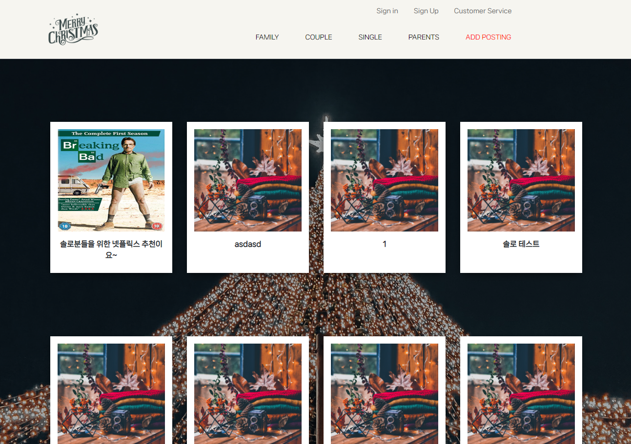 최종적인 결과물은 다음과 같고 배포까지 성공적으로 마쳤다. 크리스마스에 어떤 유형으로 보낼지(가족과 함께, 연인과 함께, 혼자서, 부모님과 함께)에 따라 카테고리가 나눠지고 카테고리 별로 게시물 작성및 게시글들을 볼 수 있다.
