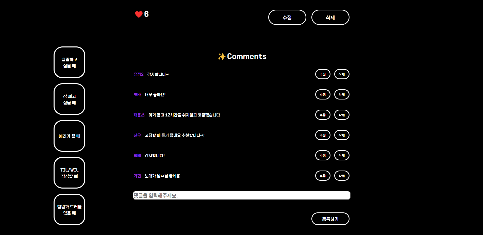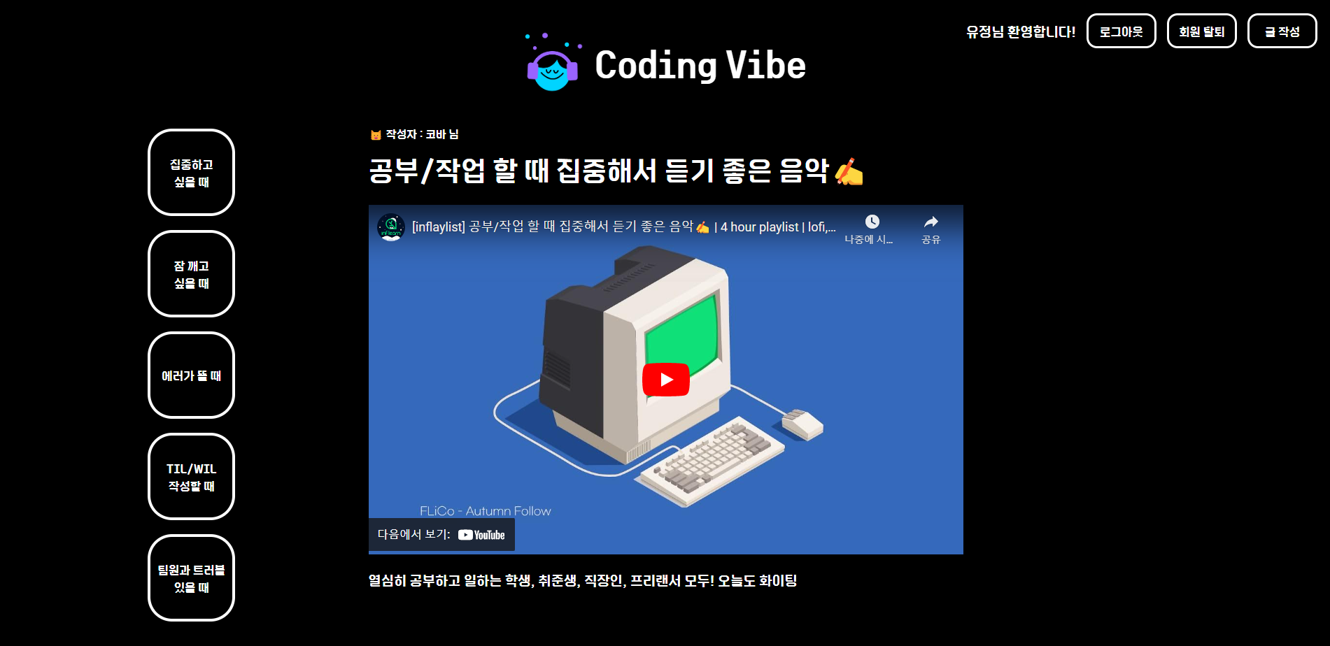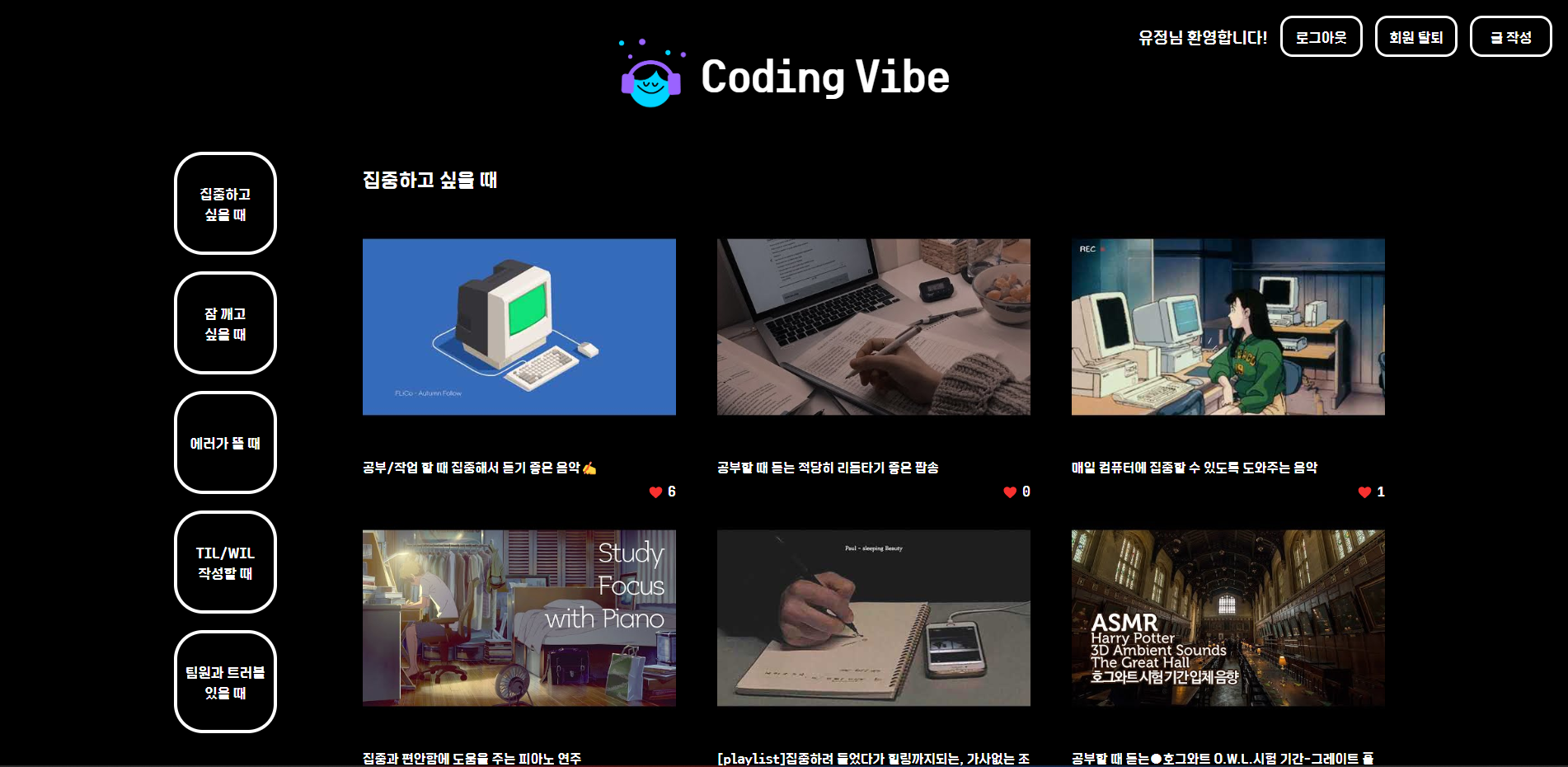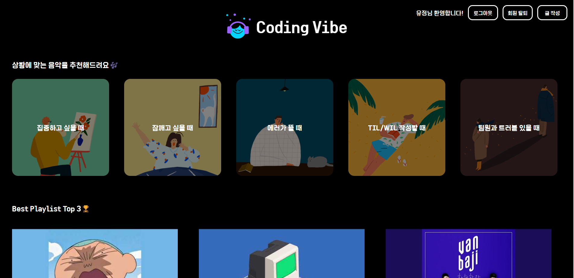 코딩할 때 좋은 플레이리스트라는 컨셉으로 코딩할 때 발생하는 상황에 따라 카테고리를 정하였다. 메인페이지에는 카테고리와 좋아요를 많이 받은 플레이리스트 Top3가 나온다.