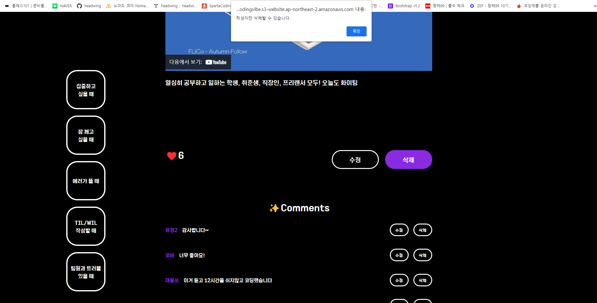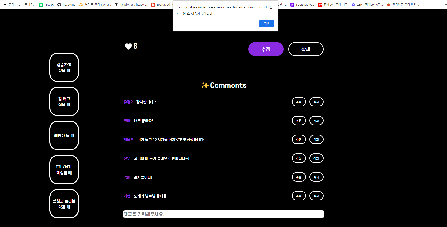 게시물 상세페이지다. 자신의 게시물 및 댓글의 수정과 삭제를 할 수 있으며, 로그인을 하지 않은 경우와 타인의 게시물 및 댓글인 경우 alert가 나타난다.