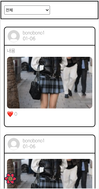 여기서 들어가자마자 보이는 전체게시판에서 select의 option을 변경하여 다른 게시판으로 페이지가 넘어가는 것이다. 이 부분은 nested router와 Outlet을 사용하여 처리해주었다. 또한 전체게시판 페이지에서 const boardMatch = useMatch("/board”);를 사용하여 boardMatch가 null이면 전체게시판이 아니라는 것이므로 null이 나오도록하고 boardMatch가 null이 아닐 시 전체게시판이므로 전체게시물에 해당하는 게시물 카드들이 나오도록 하였다.