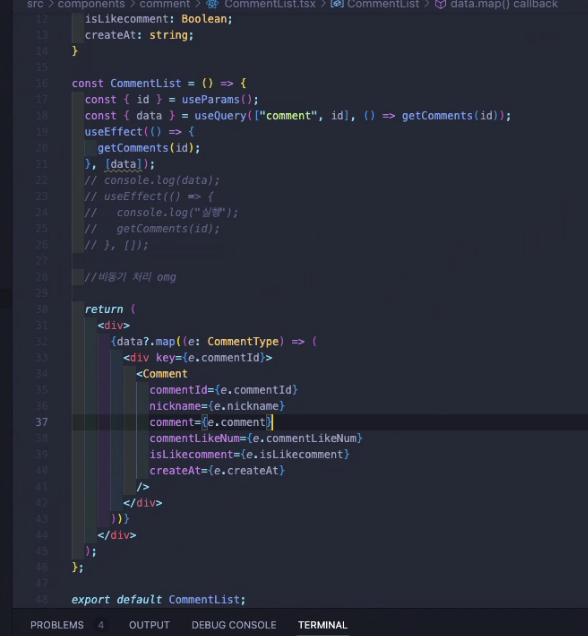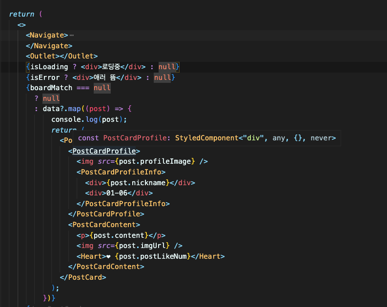 + 리턴 안에서 바로 map을 돌리는 게 아니라 위에서 처럼 리턴 안에 있는 또다른 컴포넌트에서 map을 돌리는 것이라면 반드시 return을 써야한다…..이것 때매 3시간을 고생함….하ㅠㅠㅠㅠㅠㅠㅠ 데이터는 잘 불러와지는데 화면에는 죽어도 안떠서 아무리 봐도 몰랐는데, return을 반드시 써야하는 경우와 안 써도되는 경우가 다르다는 것을 알게 되었다. 다음부터는 꼭 조심하자!!!