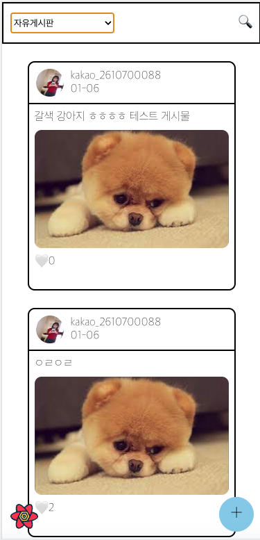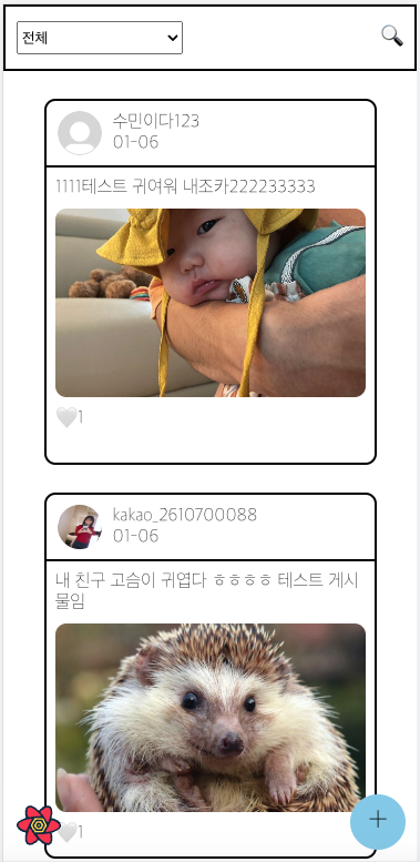 커뮤니티의 경우에는 위의 select가 있는 부분이 일정하고 아래의 게시물들이 옵션에 따라 달라지는 것을 구현해야 하였다. 그 부분은 nested router를 사용하여 구현하였다. 커뮤니티에 들어가자마자 보이는 전체 게시판은 "/ board"로, 자유게시판은 "/board/free"로, 알바고민 게시판은 "board/partTime"으로, "board/cover"는 대타구해요 게시판으로 설정하였다. 그리고 전체 게시판 페이지에 위의 select부분과 더불어 Outlet을 추가하여 달라지는 라우터에 따라 다른 게시판의 게시물들이 나오도록 하였다. 또한 들어가자마자 보이는 전체 게시판의 게시물들은 "/board"일 때만 나와야 하므로 useMatch를 사용하여 "/board"일 때만 받은 전체 게시물 데이터가 나타나도록 하였다. 또한 우측 하단의 +버튼을 누르면 게시물 추가 페이지로, 상단의 돋보기 이모지를 누를 시 검색 페이지로 이동하도록 설정하였다.