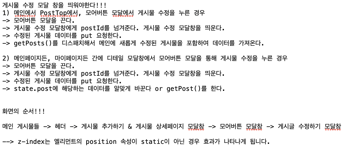 위와 같이 나름의 로직을 짜보며 게시물 수정 모달창에 대한 로직을 짜보기도 했다. 특히 게시물 수정의 경우 모달창이 3개가 동원되어야하고, 데이터 수정 요청이나 모달창 끄기와 같이 해야 할게 많다 보니 이렇게 정리하고 코딩을 하니 나름대로 잘 되었다. 그리고 모달창의 순서 역시 처음에는 막 뒤죽박죽이어서 꼬이기도 하다보니 위와 같이 정리를 하고 z-index를 수정하여 해결했다.