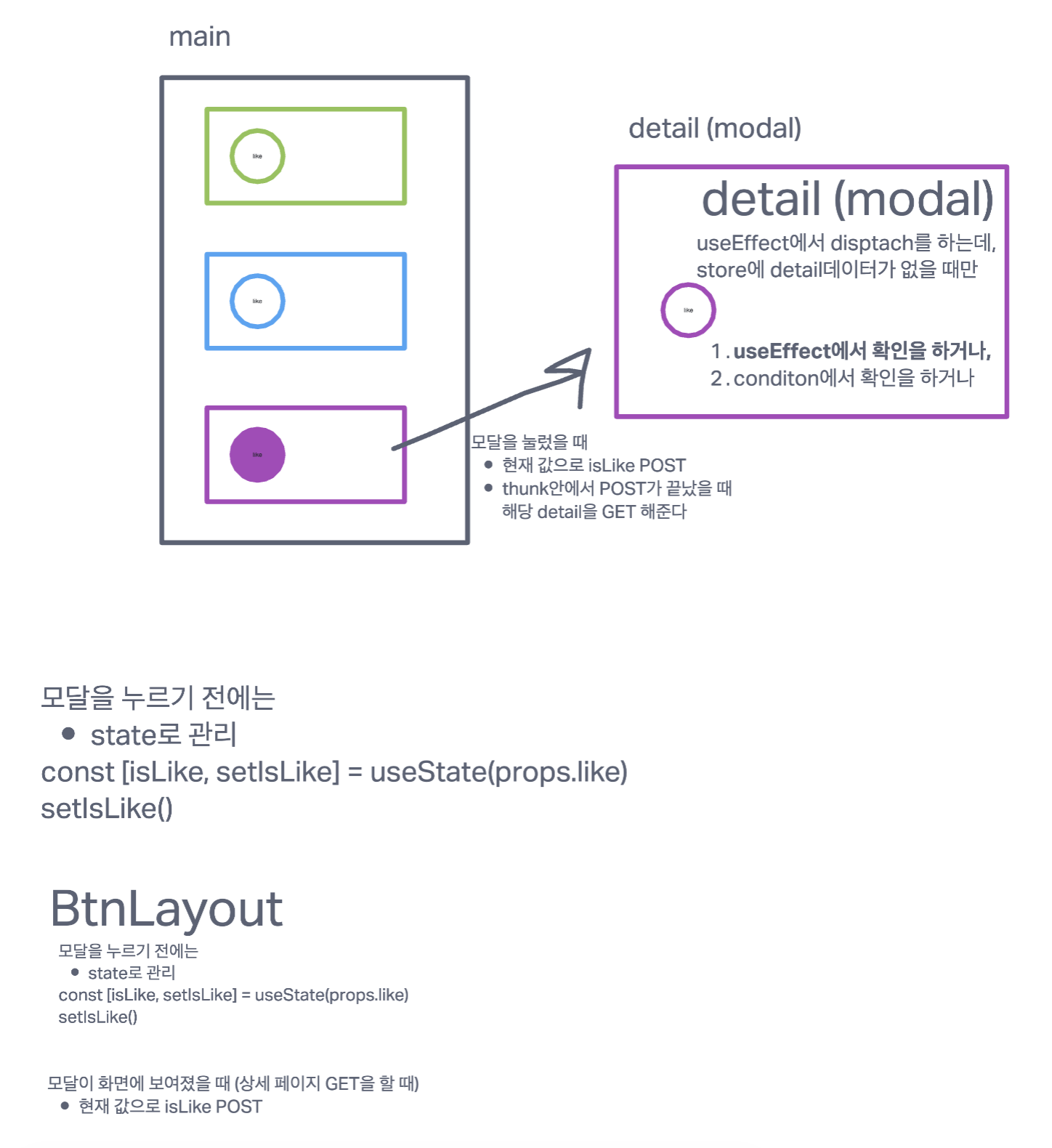 이 도식에서 변경된 부분이 많지만 결론은 모달을 누르기 전 main과 디테일 모달창의 경우를 통합하여, 서버로부터 받아온 좋아요 개수와 유저가 좋아요를 눌렀는지 여부를 나타내는 불리언 값을 useState로 저장해두었다가 유저가 좋아요를 눌렀을 때, 이 전에 좋아요를 눌렀는지 여부에 따라 하트의 모양과 좋아요 개수를 useState값을 변경하여 화면에서 하트 모양과 좋아요 개수를 변경되도록 하였다. 동시에 좋아요를 누를 때마다 하트 수정 관련 post요청을 해주었다. 그렇게 되면 서버 데이터는 좋아요를 누를 때마다 바뀔 것이므로 유저가 새로고침을 하거나 디테일 모달창을 눌렀을 때에도 바뀐 상태가 잘 나타나게 되는 것이다. 디테일 모달에서 좋아요를 누른 경우에는 메인으로 이동할 때 메인 게시물 get요청을 다시 함으로써 좋아요 데이터는 가장 최근의 상태를 유지할 수 있다.