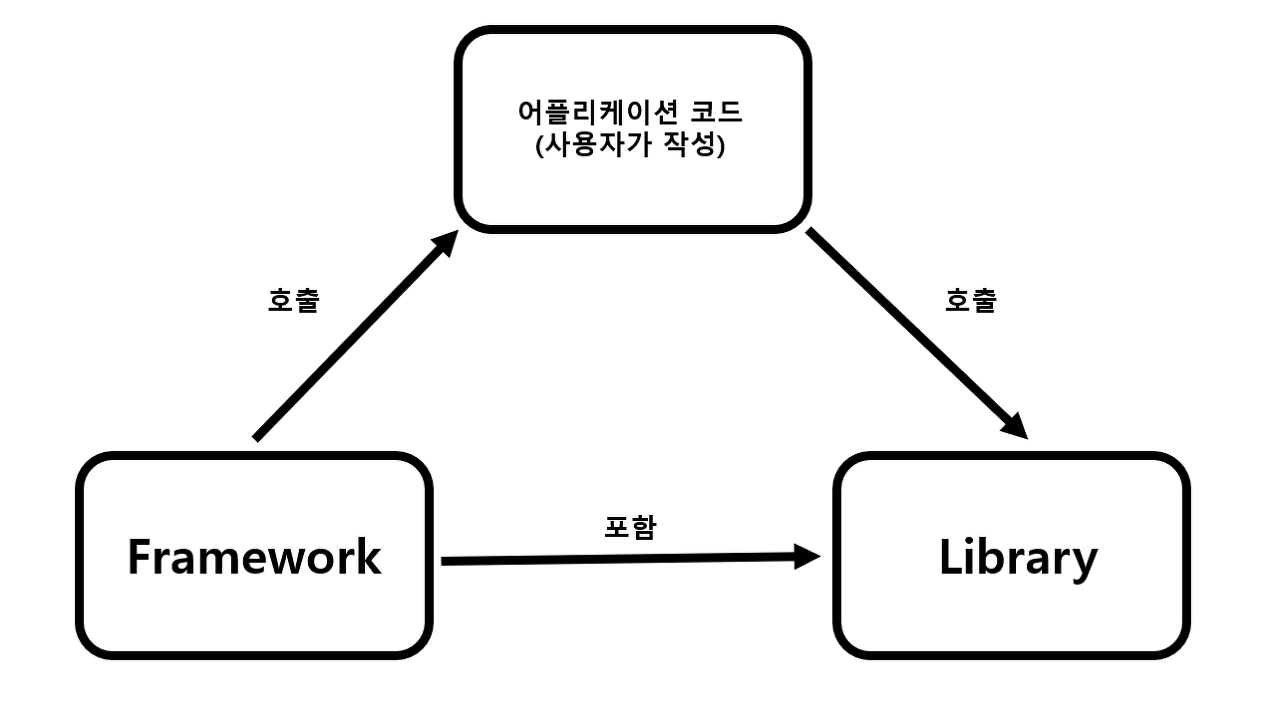 즉 간단하게 프레임워크는 완성된 제품이 아닌 완성된 제품을 만들기 위해서 개발자를 도와주는 또는 기반이 되는 역할을 합니다. 이를 소프트웨어적으로 다시 정의하면 소프트웨어의 특정 문제를 해결하기 위해서 상호 협력하는 클래스와 인터페이스의 집합입니다. 프레임워크와 라이브러리의 차이점은 "제어 흐름"의 권한이 어디에 있는가입니다. 라이브러리를 사용할 때 사용자는 애플리케이션 코드의 흐름을 직접 제어해야 합니다. 개발 시 필요한 기능이 있을 경우 능동적으로 라이브러리를 호출하여 사용하거나 기존에 구성된 함수나 코드를 가져다 써야 합니다.
