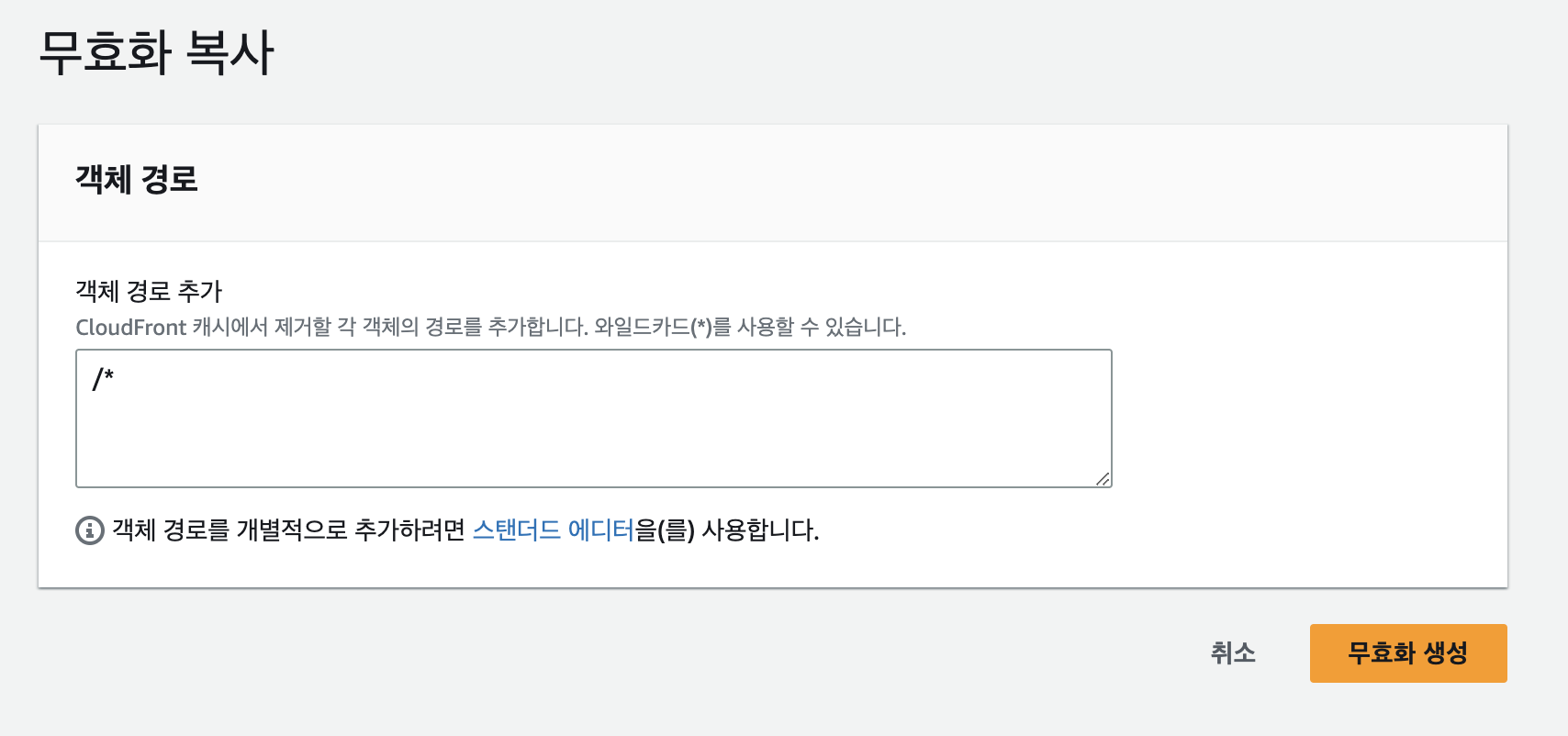 또한 Cloudfront로 배포한 경우에도 캐시 문제로 변경 사항을 deploy했을 때 바로 바로 반영안되는 현상이 있었는데, 이는 무효화를 통해 해결하였다. 나의 경우에는 파일이 크지 않아 전체를 무효화하도록 경로를 설정했다.(경로 : /*)