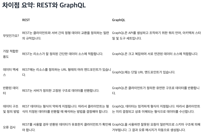 REST API는 HTTP 메서드를 사용하여 작업을 수행하는 API를 구축하기 위한 아키텍처 스타일인 반면, GraphQL은 클라이언트 사이드에서 필요한 데이터만 요청할 수 있는 API를 위한 쿼리 언어이다.